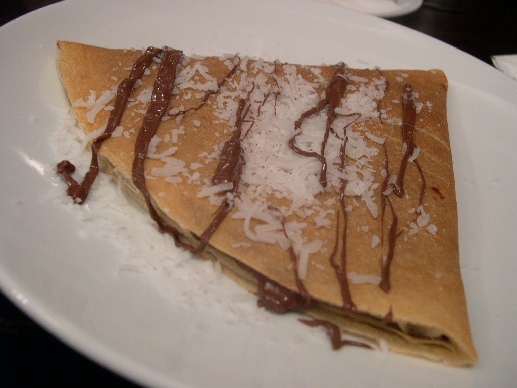 I got a crepe with Nutella and coconut shavings. It was served on a plate with some chocolate drizzle and that was about as fancy as it got. The quality was on par with some crepes I had at Konbiniya on Robson, or that place on Granville Island. Cafe Crepe is just another cafe, like most others. I have no idea why this place is considered so trendy, it really isn't that big a deal. The crepe was tasty, but nothing out of this world.